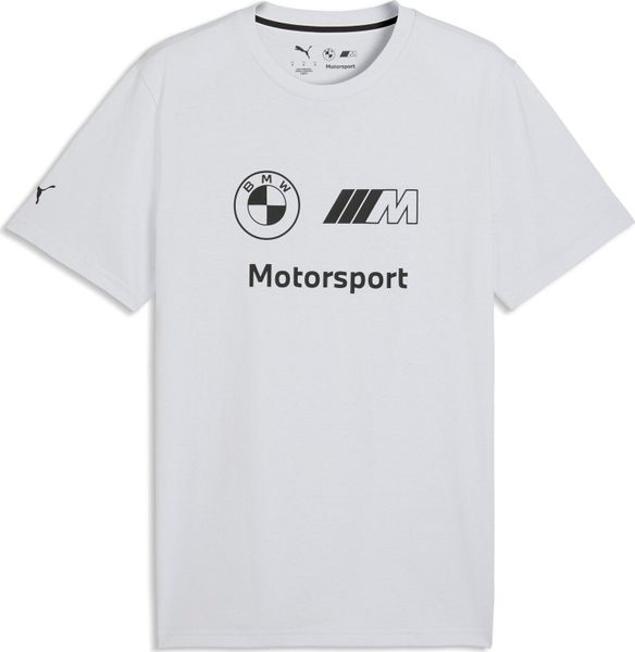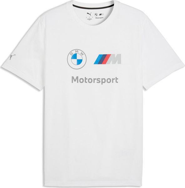 "The BMW MMS Essentials Logo Tee from Puma brings the exciting spirit of motorsport directly into your everyday life. Made from at least 20% recycled cotton, this T shirt combines sustainability and style in one. The regular fit and comfortable crew neck offer a relaxed fit that is ideal for leisure activities and everyday wear. The short sleeves and high-quality single jersey material ensure a comfortable fit, while the striking BMW M Motorsport brandingdetails make a sporty statement. Whether you're looking for a casual look for a day out on the town or a comfortable outfit for at home, this T-shirt is the perfect choice for motorsport fans who appreciate dynamism and style."