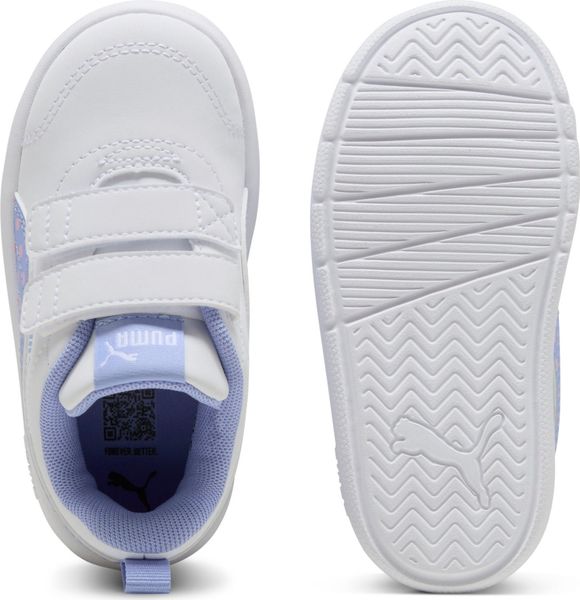"The Courtflex V3 Dotty V Inf from Puma is the ideal shoe for today's little explorers. With its modern design and colorful dot graphic on the PUMA formstrip, it attracts everyone's attention. The upper is made from at least 20% recycled materials and demonstrates Puma's commitment to sustainability. Thanks to the Velcro fastening and the padded midsole, the shoe not only offers comfort, but also easy handling for parents and children. The deep grooves in the outsole provide more flexibility and traction, making it perfect for everyday adventures. The KinderFit insole with print also makes it easier to find the right size and guarantees an optimal fit. Recommended for babies and toddlers aged 0 to 4 years, this shoe is the perfect choice for every occasion"
