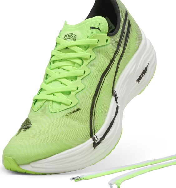 "Experience a new dimension of running with the Deviate Nitro Elite 3 Hyrox from Puma. This high-performance running shoe has been specially developed for ambitious road runners and HYROX athletes who want to break their best times. Equipped with the innovative NITROFOAMu2122 Elite technology, the shoe offers exceptional responsiveness in an extremely lightweight package. The integrated carbon fibre PWRPLATE stabilizes the midsole and maximizes energy transfer, giving you powerful propulsion with every stride"