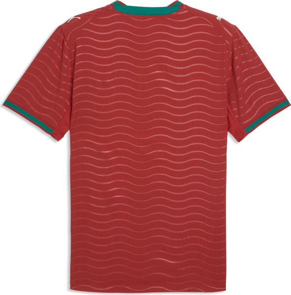 "Experience the power and passion of Portuguese football with the FPF Home Jersey Authentic from Puma. This men's jersey combines style and functionality at the highest level. The red base color, interspersed with wave-like patterns and green accents, symbolizes Portugal's connection to the ocean and the team's relentless energy. It is perfect for anyone who wants to play with heart and soul and discover the world."