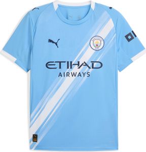 "Experience the pride and history of Manchester City with the Mcfc Home Jersey Replica from Puma. This jersey combines the iconic sky blue design with a distinctive stripe that appears on the home jersey for the first time in the club's history. This diagonal stripe design has long been a trademark on away days and brings a fresh interpretation for the next generation of fans. It combines Puma's rich past with a forward-thinking approach, making a clear statement both on and off the pitch."