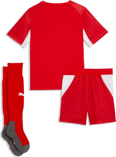 "Thanks to the double-facejacquard material, the mini kit is not only functional, but also stylish. The short sleeves and regular length make it a versatile companion for sporty activities or relaxed days out. Puma branding details and the team logo round off the design and make it a must-have for every young football fan."