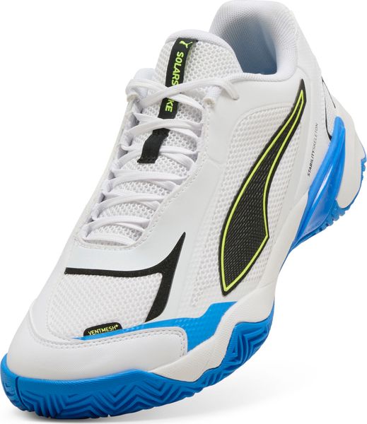 "Experience the ultimate performance with the Solarstrike 4 shoes from Puma, specially designed for indoor fitness and training. These shoes offer a perfect combination of stability and comfort, ideal for high-performance athletes. The innovative StabilitySkeleton provides comprehensive support for the midfoot, while the PWRGUARD system optimizes energy transfer and improves lateral stability. With the Ventmesh+ upper material, you benefit from outstanding breathabilityu00e4t and comfort so that you can stay cool and focused even during intensive training sessions"
