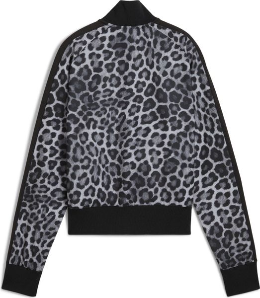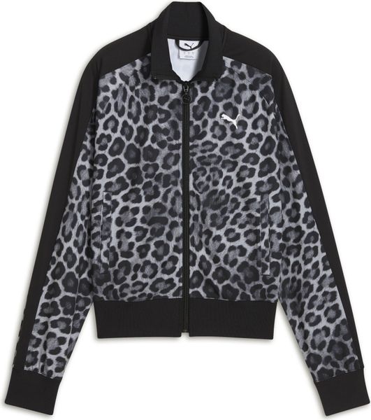 - "Unleash your wild side with the PUMA track jacket featuring a leopard print throughout, T7 inserts and a two-way zipper. Ribbed cuffs and hem offer a snug fit, while the embroidered PUMA Cat logo adds authenticity."