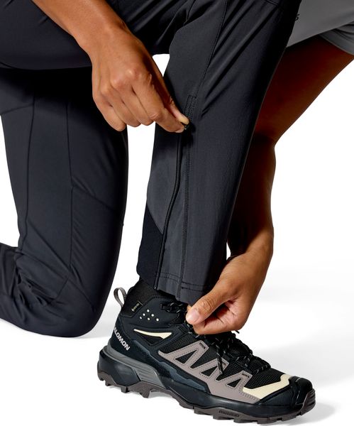 "Particularly noteworthy are the reinforced inner leg cuffs, which protect against tears caused by crampons and increase the durability of the trousers. The elasticated, flat waistband ensures maximum comfort, even under a climbing harness, while the shaped knee section and long gusset in the crotch ensure unrestricted freedom of movement on the ascent. The adjustment options with press studs at the hem make it easy to combine with a wide variety of footwear."
