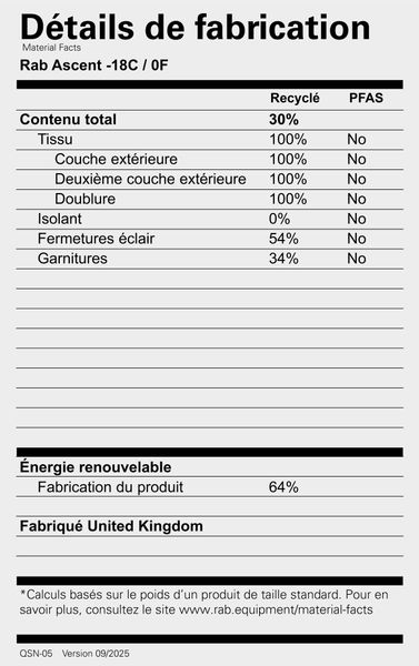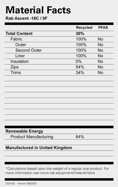 "" """A ""special ""highlight ""is ""the ""additional, ""shorter ""zipper, ""which ""offers ""arm ""room ""and ""at ""the ""same ""time ""stores ""the ""warmth ""in ""the ""sleeping ""bag ""u2013 ""ideal ""for ""cooking ""in ""icy ""temperaturesu2013. ""The ""integrated ""valuables ""compartment ""ensures ""that ""important ""items ""are ""always ""to ""hand. ""The ""Ascent ""-18C ""/ ""0F ""is ""hand-filled ""in ""Derbyshire, ""United ""Kingdom, ""and ""features ""sustainable ""materials ""such ""as ""fluorocarbon-free ""20D ""Pertexu00ae ""Quantum ""Nylon ""Ripstop ""and ""recycled ""20D ""Nylonlining."