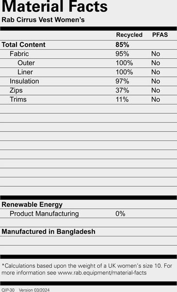"The Cirrus Vest Wmns by Rab is the ideal choice for adventurous women who want to rely on the highest level of functionality and comfort during their outdoor activities. This vest is specially designed for demanding activities such as hiking, mountaineering and alpine tours. Thanks to the innovative PrimaLoftu00u00ae Silver RISEu00e insulation, body heat is effectively trapped, guaranteeing a cozy and warm feeling even in icy temperaturesu00f. The insulation is made from 100% recycled material and offers impressive bulk with minimal weight"
