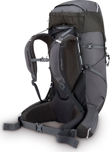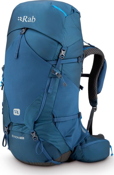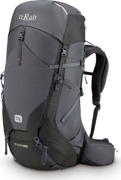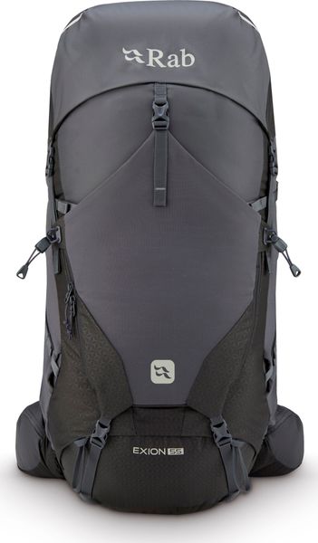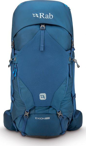 "The Exion 55 from Rab is the ideal companion for trekking adventures and longer hikes. Thanks to the innovative V-TRAXu2122 carrying system with an easily adjustable Velcro fastening system, the backpack adapts perfectly to your back, which ensures optimum comfort. The body-hugging, pre-shaped harness construction and molded lumbar pad provide additional comfort, even when fully loaded. The hip belt can be easily adjusted while walking, which ensures a stable fit and supports the load transfer through the 6 mm thick aluminum frame."