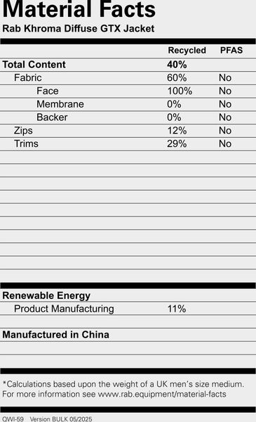 "The Khroma Diffuse GTX jacket from Rab is the ideal companion for demanding skiers who value the highest level of functionality and safety. Thanks to the high-quality 3-layer GORE-TEX material with ePE membrane, the jacket offers excellent protection against wind and wet conditions, while the 28,000 mm water column ensures that you stay dry even in extreme weather conditions. The integrated RECCOu00eaeu00f6 technology increases safety in alpine terrain by making it easier for rescue teams to locate you in an emergencyu00e4."