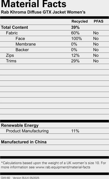 "The Khroma Diffuse GTX Jacket Wmns by Rab is the ideal choice for passionate female skiers who rely on the highest level of functionality and protection in the mountains. This women's jacket features robust and breathable 3-layer-GORE-TEX technology that reliably protects against wind and moisture. With an impressive wateru00e4ule of 28,000 mm, you stay dryeven in extreme weather conditions. The longer cut with integrated snow guard prevents powder snow from getting in, so you can glide down the slopes without a care in the world."