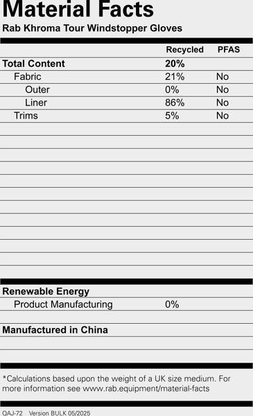 "The Khroma Tour Windstopper Gloves by Rab are the perfect choice for anyone who doesn't want to compromise on protection and comfort when ski touring and skiing. These unisex gloves combine the advanced WINDSTOPPERu00ae product technology from GORE-TEX LABS with a soft fleece lining to provide optimum wind protection while effectively managing moisture. This keeps your hands warm and dry, even in icy conditions on the summits."