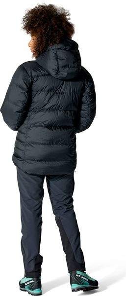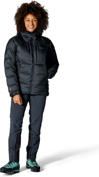 "The Positron Pro Hoody Wmns by Rab is the ideal companion for extreme weather conditions when climbing, on expeditions or when mountaineering and alpine touring. This down jacket, specially developed for women, offers optimum protection from cold spots thanks to the full-length box wallchamber construction, while the smaller midi chambers on the arms and sides ensure maximum freedom of movement. With a filling made from high-quality 800 cuin down, the body heat is optimally preserved even in icy temperatures"