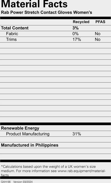 "Whether as a stand-alone glove in changeable weather or as an insulating layer under an outer glove in harsh alpine conditions, the Power Stretch Contact Gloves Wmns offer versatility. With an outer fabric of 53% polyester, 38% nylon and 9% elastane at a weight of 241g/mu00b2, they are robust and durable without sacrificing freedom of movementu00fcu00dfen."