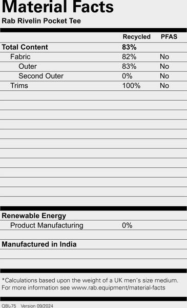 "The Rivelin Pocket Tee from Rab is the perfect choice for anyone who doesn't want to compromise on comfort during outdoor adventures. This tee combines a classic look with state-of-the-art functionality, ideal for activities such as climbing and hiking. Made from quick-drying Dryflou2122 material, it ensures that moisture is effectively wicked away from the body. This keeps the skin pleasantly dry and cool even when temperatures rise."