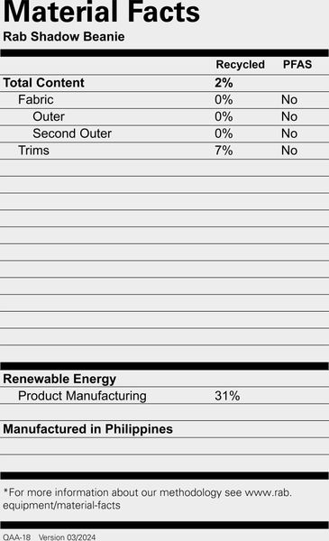 "The Shadow Beanie from Rab is the ideal headwear for anyone who doesn't want to miss out on outdoor adventures even in adverse weather conditions. Made from the advanced Polartecu00u00ae Wind Prou00ae material with Hardface technology, this hat offers excellent protection against wind and coldu00e4lte. The single-layer design ensures that the beanie is lightweight and fits perfectly to the head, while the flat seams provide additional comfort and prevent pressure points."
