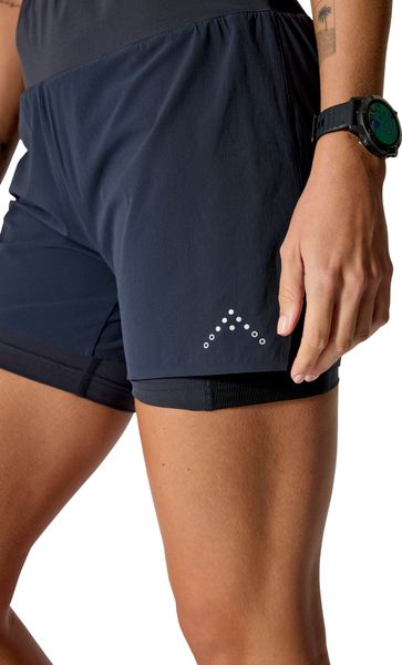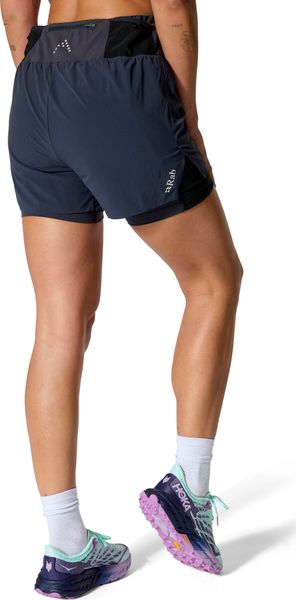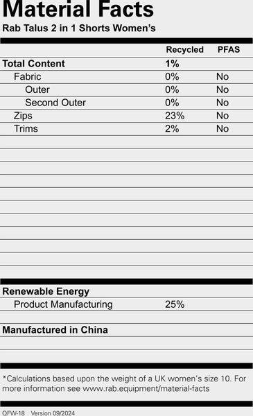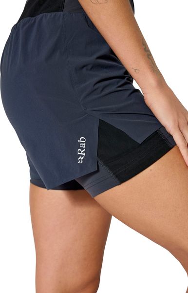 "Experience unmatched comfort and freedom of movement with the Talus 2 in 1 Shorts for women by Rab, specially designed for speed hiking and running. These shorts combine a lightweight Matrixu2122 softshell fabric that dries quickly and offers maximum flexibility with a supportive inner brief that stays securely in place thanks to a silicone strip. The sophisticated construction with a side slit ensures unrestricted freedom of movement, even in demanding terrain."