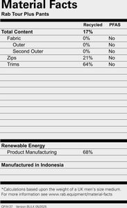 "The Tour Plus Pants from Rab are the ideal choice for men who are looking for adventure in the mountains. Whether skiing, indoor climbing or on demanding ski tours and alpine toursu2013 these softshellu2013 pants offer unrestricted freedom of movementu2013 thanks to their elastic, slim-fit and pre-shaped design. Made from a double-woven matrixu2122stretchnylon with a fluorocarbon-free DWRcoating, they not only offer protection from the elements, but also excellent durability, which is ensured by strategically placed reinforcements at the hem and inner leg cuffsu00e4."