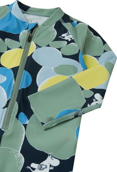 "Discover the ultimate protection for sunny days with the "Moomin Sandig" from Reima. This garment not only offers a stylish Moomin print, but also excellent UV protection with a factor of 50+, tested according to the EN 13758-1 +A1 standard. The elasticated material ensures an optimum fit and freedom of movement, while the long sleeves offer additional protection. The flat seams increase comfort and prevent unpleasant chafing on the skin."