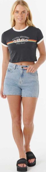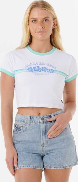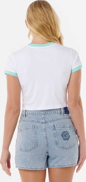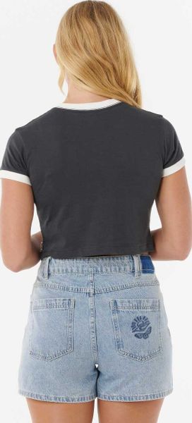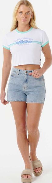 "The Keepsakes Baby Tee from Rip Curl is a casual, short-sleeved T-shirt that is perfect for leisure and everyday wear. Made from high-quality, stone-washed cotton jersey, it offers a comfortable feel and classic comfort. The print on the front gives the shirt a special touch, while the print on the inside of the neckline provides a stylish accent. The design is rounded off with a woven flag label, which gives the shirt an additional touch of authenticity and brand identity. This shirt is an indispensable essential for every wardrobe"