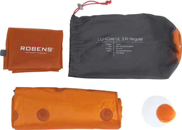 "The LightCore UL 3.1R Regular mat from Robens is the perfect companion for all campingadventures. As an ISPO Award winner, it has been specially developed to optimize ultralight outdoorexperiences with its exceptional warmth and lightweight construction. The mat is ideal for use in two to three seasons as it is equipped with foil insulation, which offers an excellent warmth-to-weight ratio. The 15D 430T nylon material with ripstop and TPU coating ensures durability and protection from the elements."