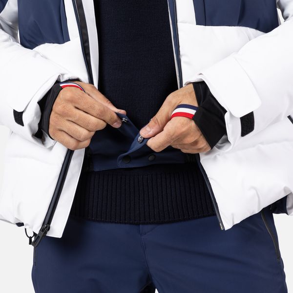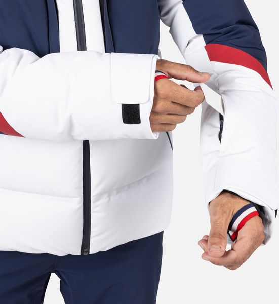 "The jacket is equipped with an impressive 20,000/20,000 waterproof membrane that keeps you dry even in heavy rain. Filled with the highest quality, traceable down from Duvet du Faubourgu00u00ae in France, it offers feather-light warmth. Practical features such as an integrated snow skirt, a ski pass pocket, cuffs with thumb loops and an inner mesh pocket make your days on the slopes carefree and comfortable"