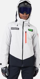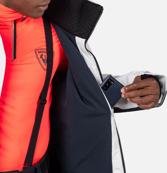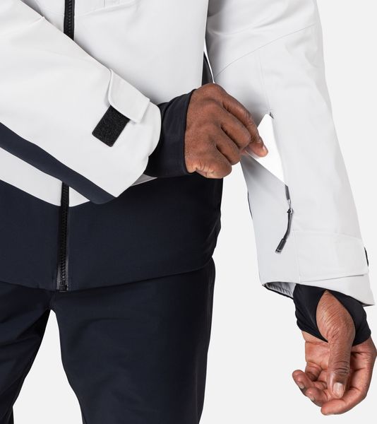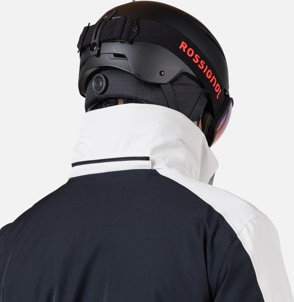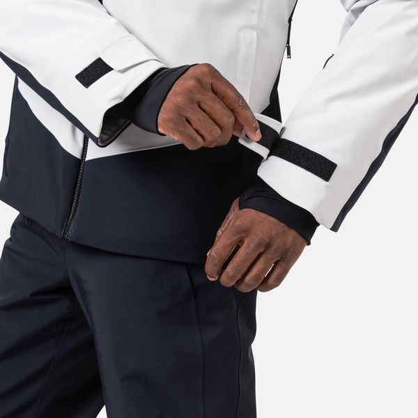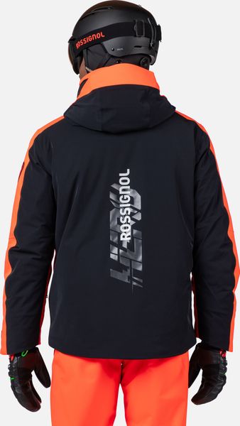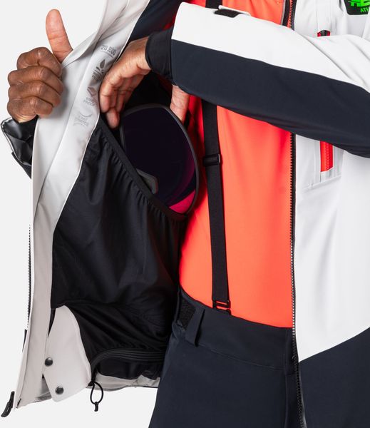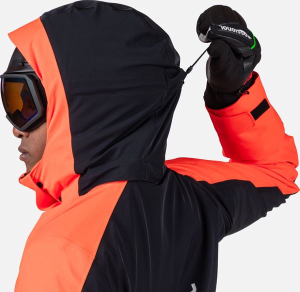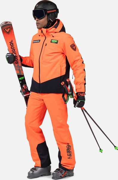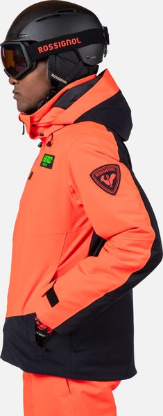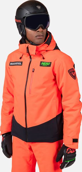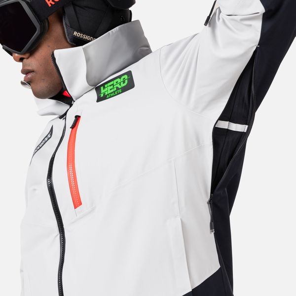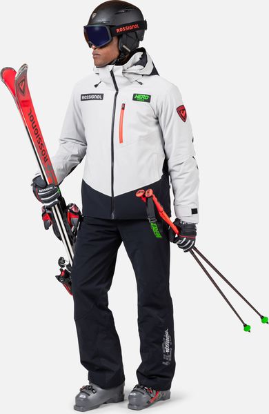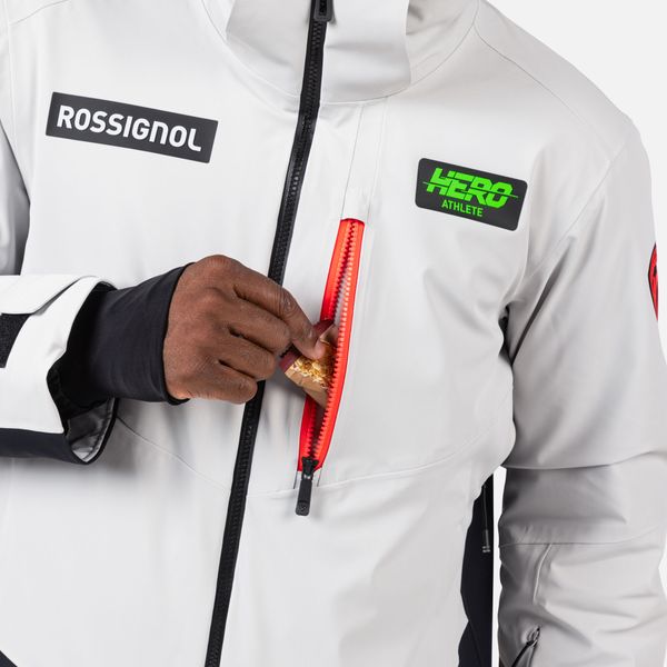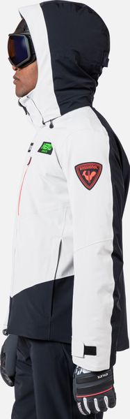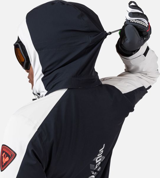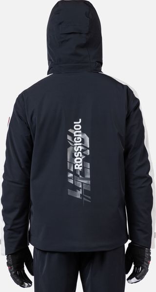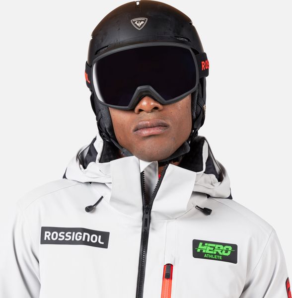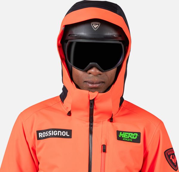 "The jacket is equipped with fully taped seams that offer comprehensive protection against wind, snow and rain. Practical details such as stretch cuffs with thumb loops, an integrated snow guard and an attached goggle cloth increase comfort in cold weather. The Hero graphic pays tribute to the Rossignol tradition of speed, and the detachable hood allows you to customize the look"