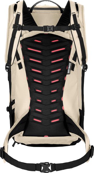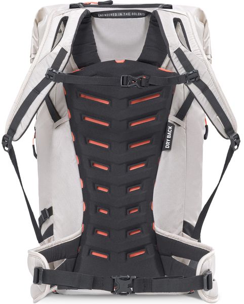 "The Dry Back Custom carrying system, which was developed in collaboration with experienced mountaineers, ensures optimum carrying comfort. It offers an adjustable back length and padded, split shoulder and hip straps that are specially adapted to the female anatomy. Load control straps and a split hip belt guarantee stability and effective load transfer to the hips."