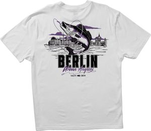 "The Berlin Urban Angler SS Tee by Salty Crew is a unique piece of clothing that is part of the limited Urban Anglers Graphics Series. It features original graphics by artist Wenceslas Remusat, depicting his interpretation of street fishing in the heart of Berlin. These graphics are inspired by the quiet moments along the city's rivers and canals, capturing the raw intersection of urban life and fishing culture. The shirt celebrates those who find the fish where others only see the cobblestones."