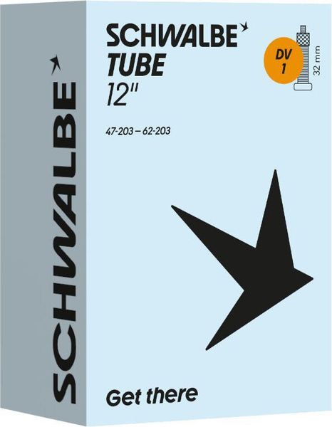 "The Schwalbe DV1 standard inner tube is the perfect choice for anyone who values durability and reliability. This inner tube is specially designed for 12-inch bicycle tires with the ETRTO-greenu00f6u00dfen 47/62-203. Thanks to the excellent material quality and the uniform wall thickness, it retains air for an above-average length of time and thus ensures a carefree riding experience."
