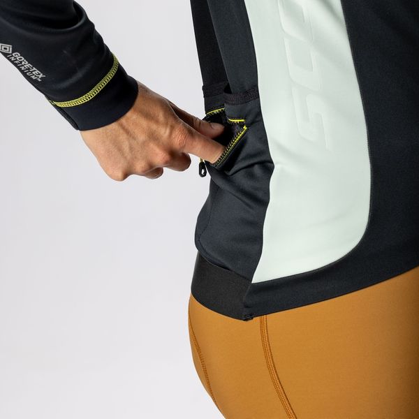 "The jacket not only impresses with its functional properties, but also with its environmentally friendly production from recycled material remnants as part of the REMIXprogram. The race-optimized cut ensures maximum performance on the bike, while elasticated waistbands and stretch inserts on the sides and under the arms ensure maximum freedom of movement. Practical details such as three back pockets and an additional water-repellent pocket offer plenty of storage space for important items. The meshinsert under the pocket improves ventilation and the non-slip silicone strip at the bottom hem prevents the jacket from slipping during the ride"