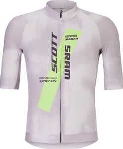 "Practical details such as the three back pockets, including a water-repellent pocket, offer plenty of storage space for your most important items. The non-slip silicone strip on the bottom hem ensures that the jersey always fits perfectly. Inspired by the World Cup SCOTT-SRAM pro team, the design features a special print that underlines your passion for road cycling. With the Re-source by SCOTT approach, the jersey also focuses on sustainability and environmental awareness."