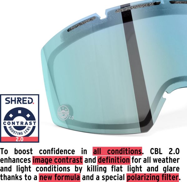 "The SHRED. CONTRAST BOOSTING LENSu2122 technology, available in version 2.0 on selected models, takes image contrast and clarity to a new level. This technology suppresses flat light and glare so that you can enjoy a clear view in any weather and lighting conditions. Thanks to the SHRED. NODISTORTIONu2122 technology, vision remains crystal clearu2122 even with differences in height."