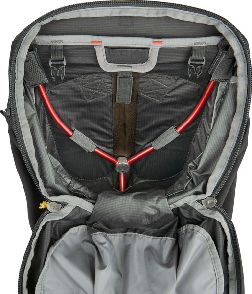 "Another highlight is the U-shaped zipper on the top, which allows quick access to the main compartment. The hydration sleeve, which serves as a detachable summit bag, also demonstrates the versatility of this backpack. The Flex Capacitor is not just a backpack, but a well thought-out system that keeps your equipment safe and organized. Please note that the rain cover is available separately."