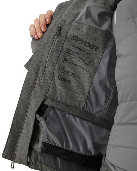 "The Falline Melange Down Jacket by Spyder is the perfect choice for women who want to stay stylish and warm in extreme weather conditions. This jacket combines innovative technologies with luxurious materials to provide unmatched protection and comfort. The EXO SHIELD 30K technology ensures a wateru00e4ule of 30,000 mm, making the jacket extremely water repellent, while the windproof feature offers optimal protection against cold winds."