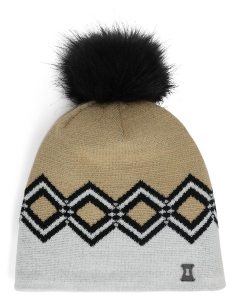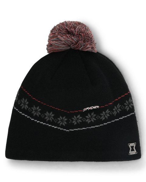 "Sustainable women's hat made from recycled polyester with a colorful bobble and unique Spyder graphics."