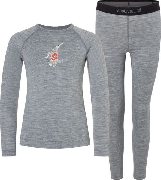 "The SKI BUNNY SET from Super.Natural is the perfect base layer set for young adventurers on the ski slopes. It consists of a soft longsleeve with a charming ski bunny print and matching long johns, which together form a harmonious ensemble. Made from the innovative ADVANCED WOOL 175, which consists of a blend of 50% merino wool and 50% polyester, this set offers excellent thermal insulation while remaining breathable."