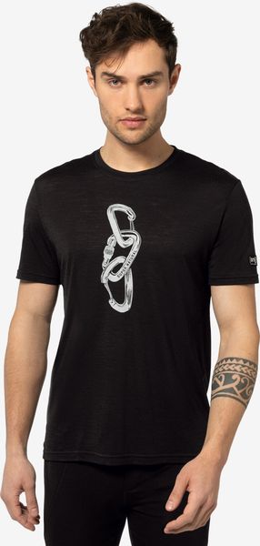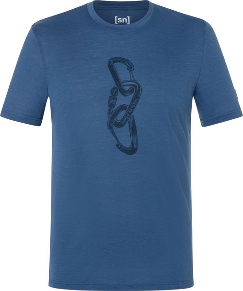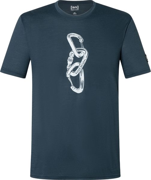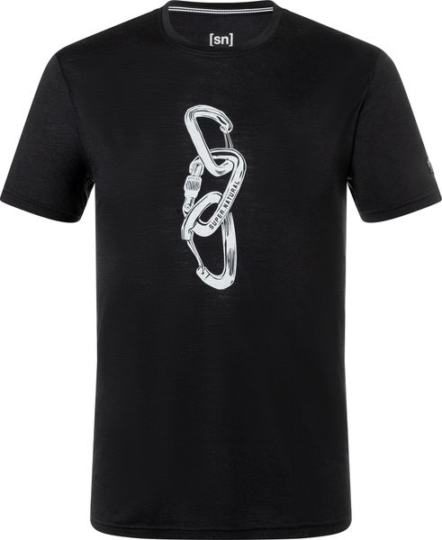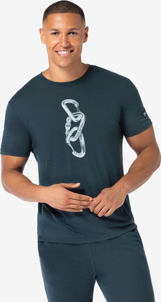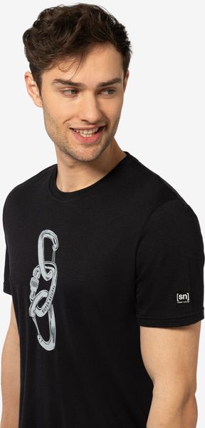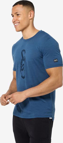 "Stylish and functional T-shirt for climbing and everyday activities with a unique carabiner print and merino wool."