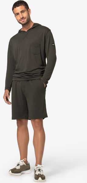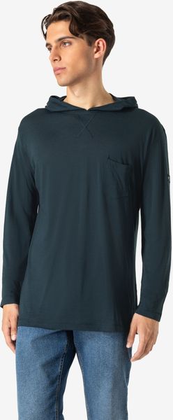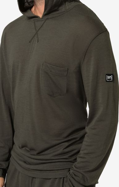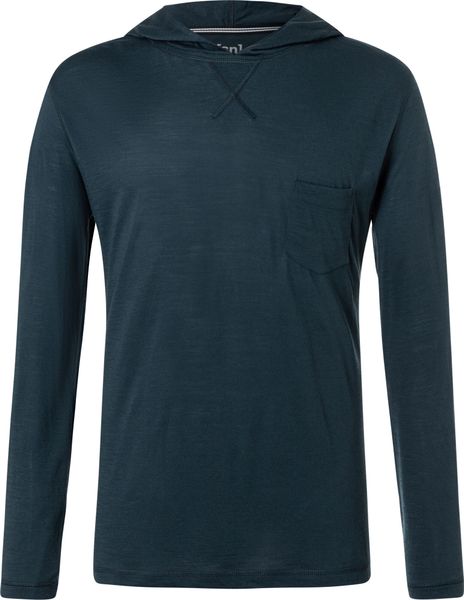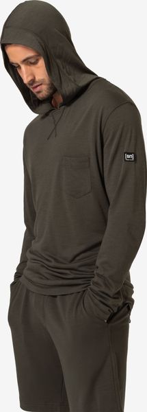 "Men's wool hoodie for hiking and traveling, with hood and chest pocket for comfort and casual style."