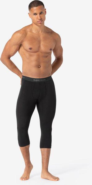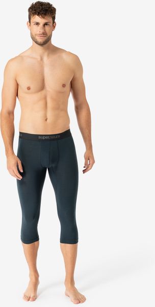 "Lightweight, odor-repellent 3/4 merino tights for men, ideal for skiing and hiking with an elastic waistband."