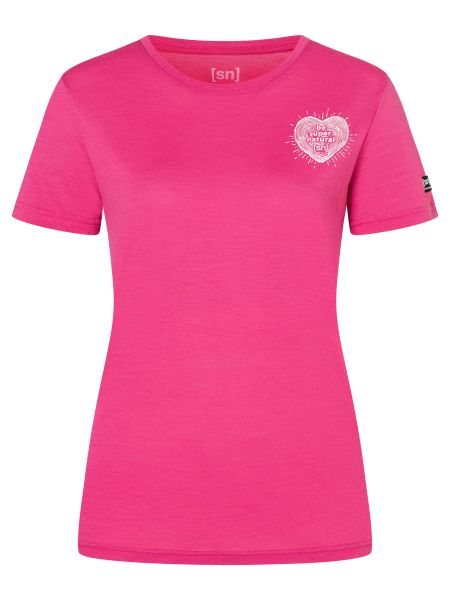 "Versatile women's merino T-shirt with heart print, ideal for everyday and outdoor use, breathable and easy-care."