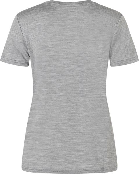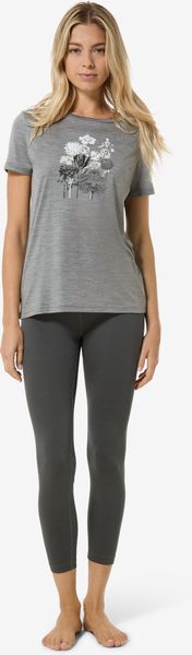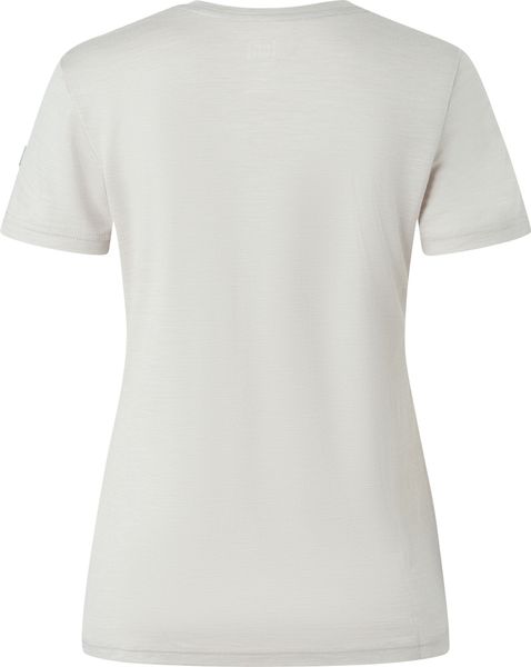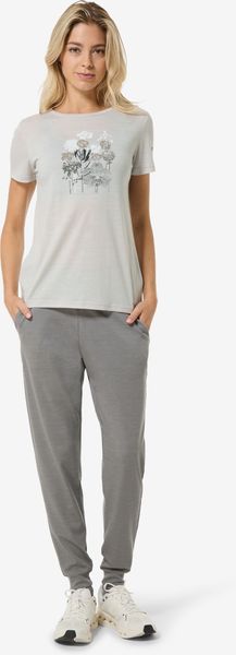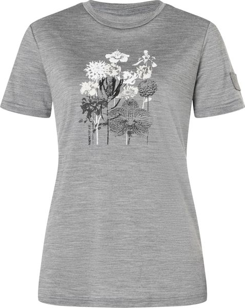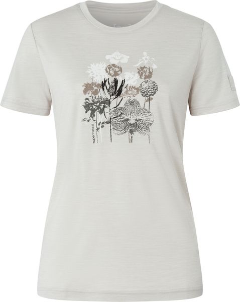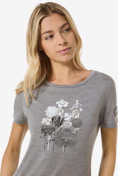 "Sustainable women's T-shirt with merino wool, PrimaLoftu00u00ae Biou2122 and floral print, ideal for leisure and everyday wear."