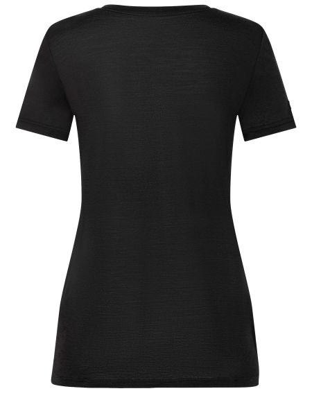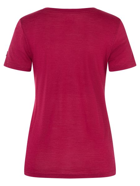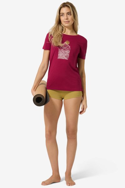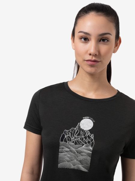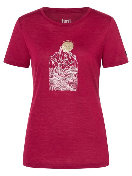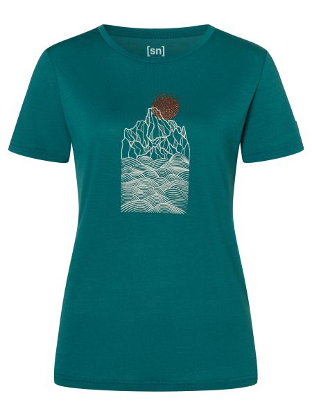 "Versatile women's merino T-shirt with UV protection and mountain print, ideal for outdoor adventures and everyday wear."
