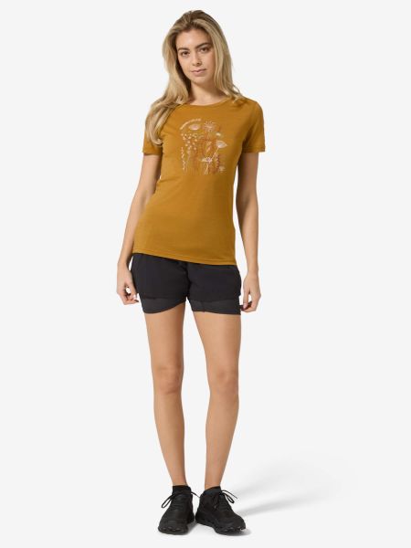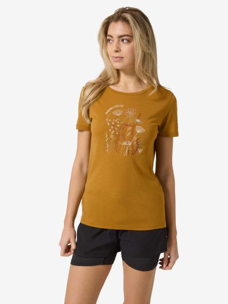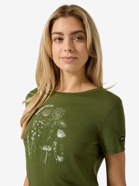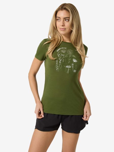 "Lightweight merino T-shirt with UV protection and floral design, ideal for everyday wear and outdoor activities."