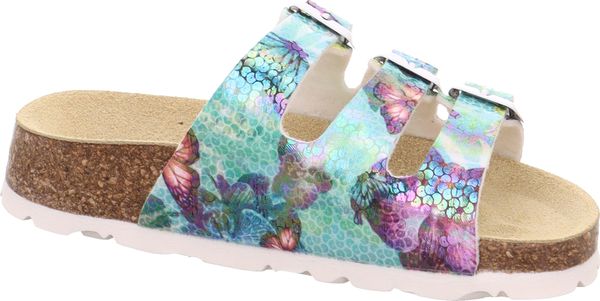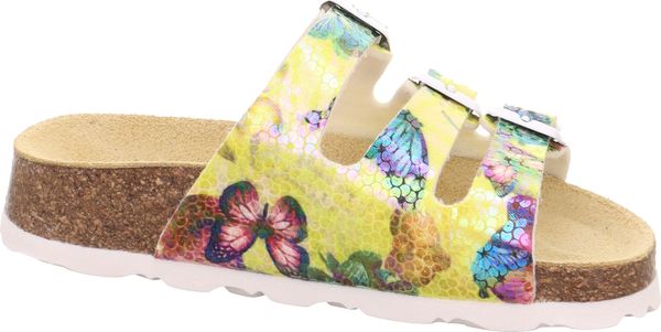 "Comfortable and stylish girls' slipper with elastic design and sustainable cork sole, ideal for leisure and everyday wear."