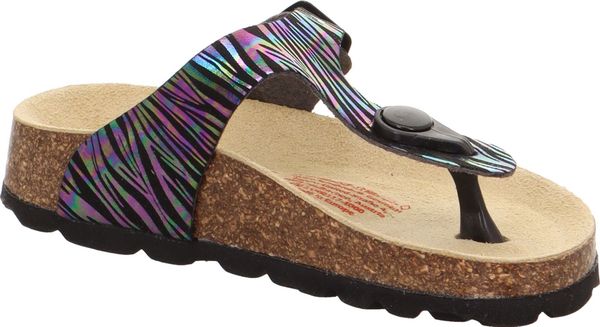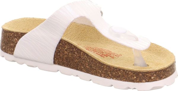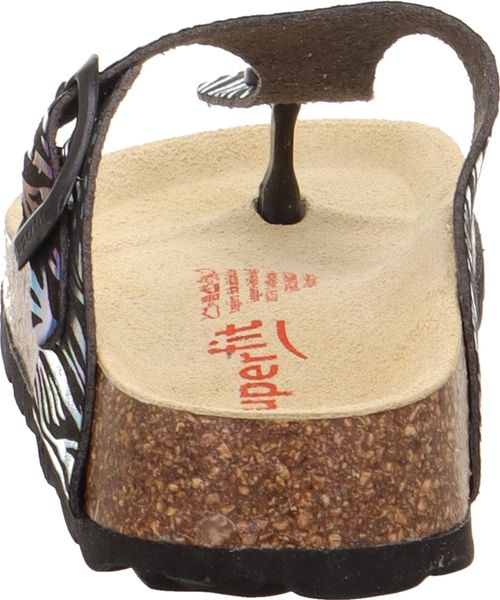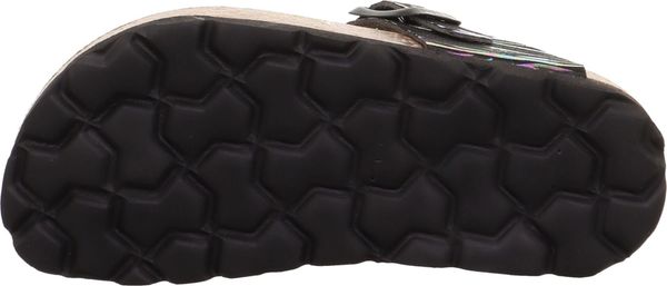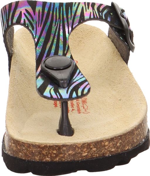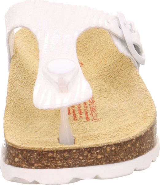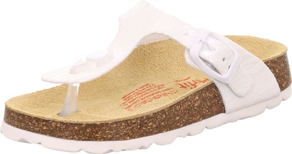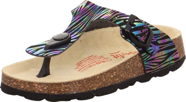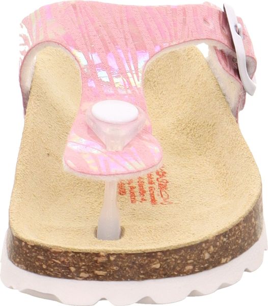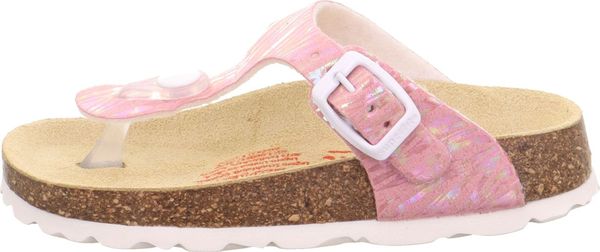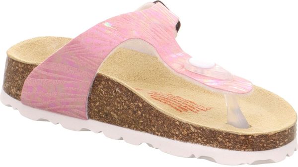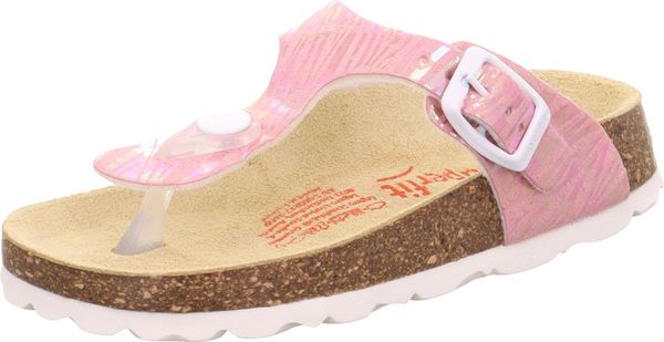 "A glamorous appearance for the feet: that's the promise of the superfit FOOTBED PANTOFF made from a sophisticated material with glitter elements. Thanks to the leather-covered cork footbed, the sandal offers support and great walking comfort. With its toe strap and fashionable buckle on the side, the shoe is perfect for outdoors. Of course, they look just as good at home, at nursery or at school"