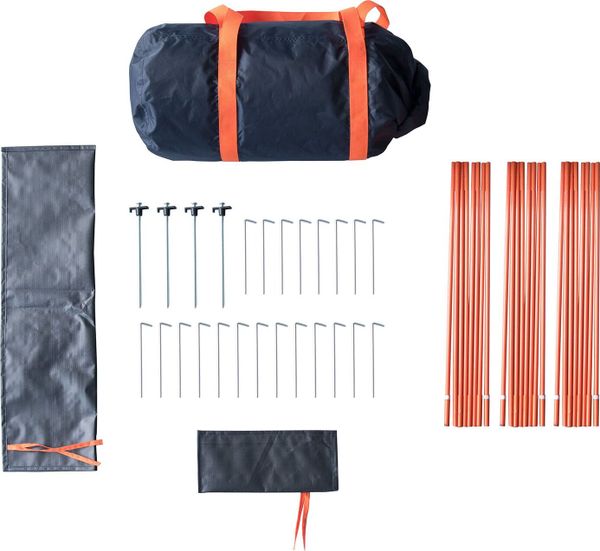 - "Double roof tunnel tent with standing height sleeping cabin with partition wall Large front entrance with 2 side window angles made of taped TPU 2 permanent vents with side spacers 1 permanent vent with rear tensioning function Separate floor tarpaulin in the entrance area Additional zipper for passing through a power cable Roof lining rope inside pockets 2 lamp holders"