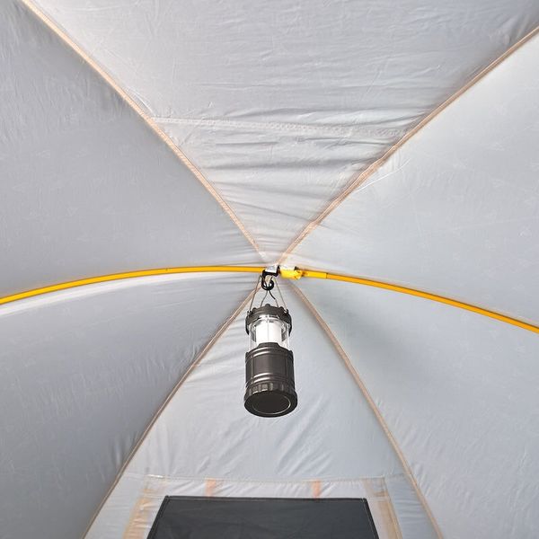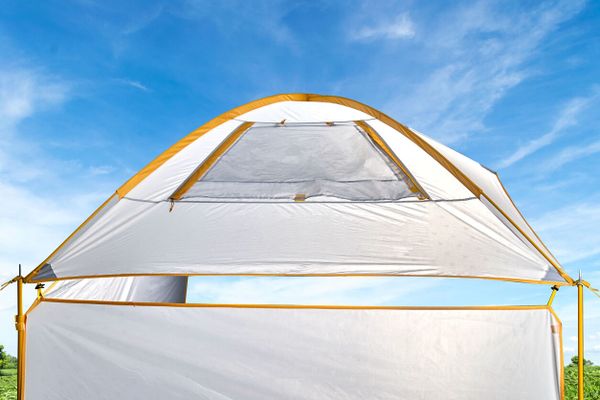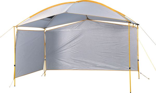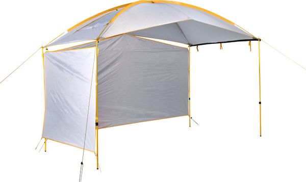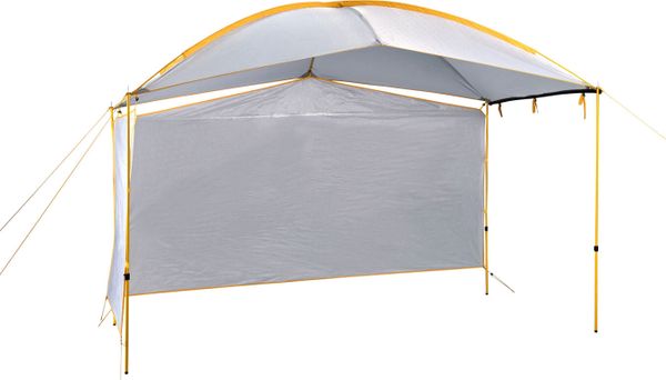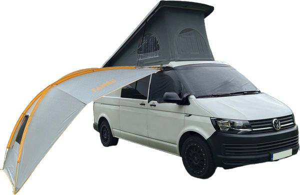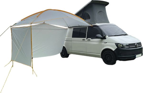 "Practical, flexible awning for traveling and camping with windproof, water-repellent material made from recycled polyester."