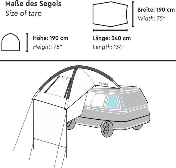 "The BASANT sun sail from TAMBU is the ideal companion for all your outdoor activities, whether you are traveling, camping or in your free time. With its multifunctional use, it not only offers you protection from the sun and light rain, but also from prying eyes. The construction is windproof and made from 100% recycled polyester, which not only protects the environment but also ensures durability. Thanks to the 2000 mm water column, the interior remains dry even in light rain"