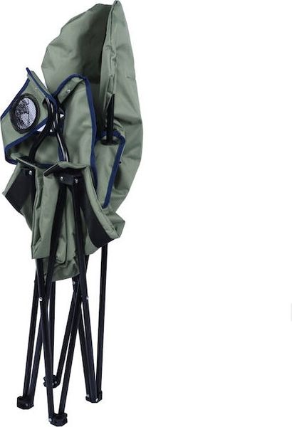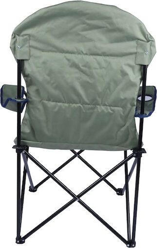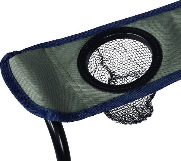 "Versatile camping chair with robust steel frame, integrated drink holder and sustainable rPET polyester cover."