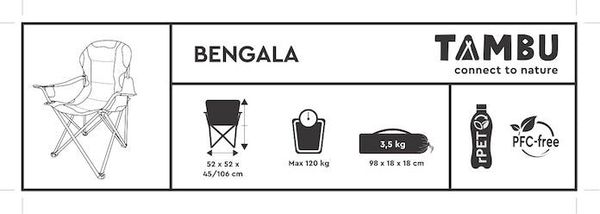 "With an impressive load capacity of up to 120 kg and a weight of just 3.1 kg, the BENGALA is both stable and easy to transport. The chair can be folded to a compact packing size of approx. 97 u00d7 17 u00d7 17 cm and can be conveniently stowed away in the carrying bag supplied. The cover made of durable 600D rPET-polyester, made from recycled PET-bottles, underlines TAMBU's commitment to sustainability and environmental awareness."